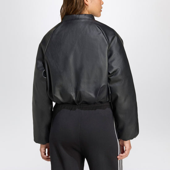 Cropped adidas Originals bomber jacket in black faux leather featuring a front zip closure, long sleeves, two side zip pockets, tone-on-tone logo embroidery on the chest and a loose fit.