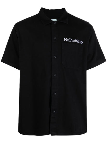 slogan-embroidered cotton shirt from ARIES featuring black, cotton, embroidered slogan, mini logo tag, classic collar, front button fastening, short sleeves and straight hem. Logo short sleeves shirt Size and Fit - This piece fits true to size. We recommend you get your regular size. Model is 1,84m / 6ft 1in wearing size M