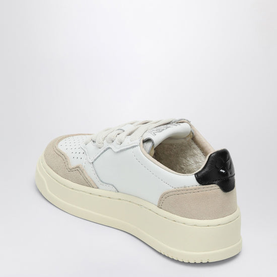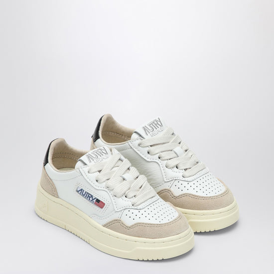 White leather sneaker from Autry featuring a rounded, perforated toe, black heel on the back in a contrasting colour, a lace-up closure and a padded tongue.
