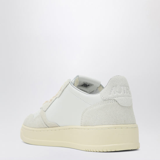 White leather and suede low Medalist trainer by Autry features a perforated toe, lace-up front fastening, leather tongue with matching stitched label, padded collar, back heel with embossed logo, leather and cotton terry lining and cream-coloured rubber sole.