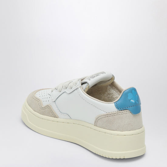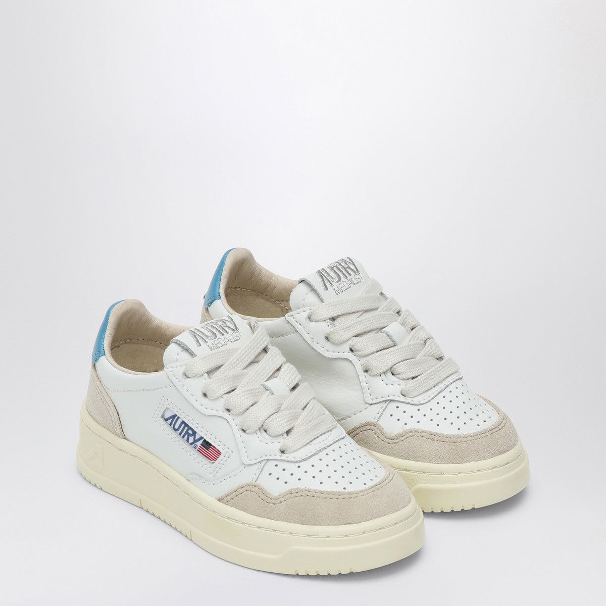 White leather sneaker from Autry featuring a rounded, perforated toe, light blue heel on the back in a contrasting colour, a lace-up closure and a padded tongue.
