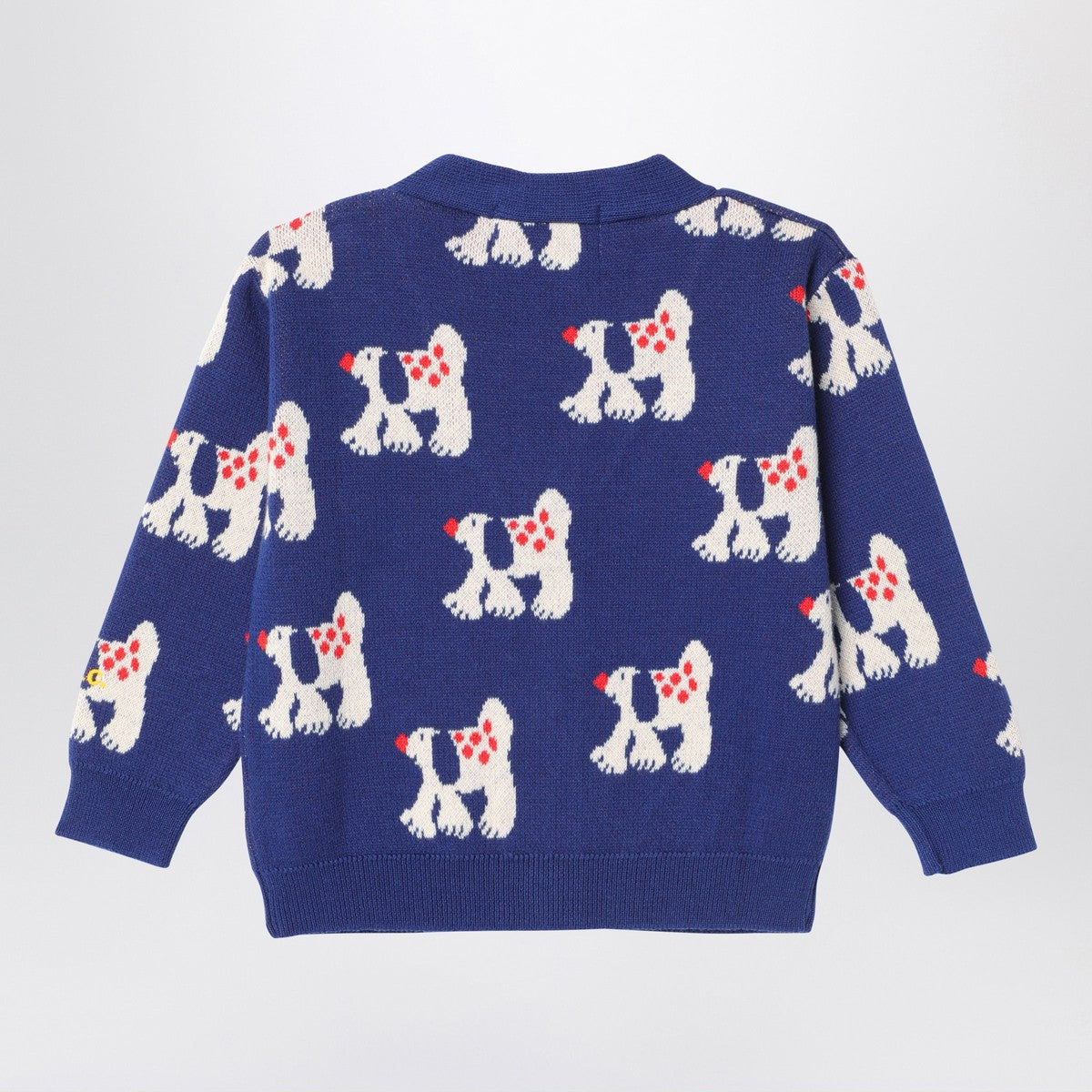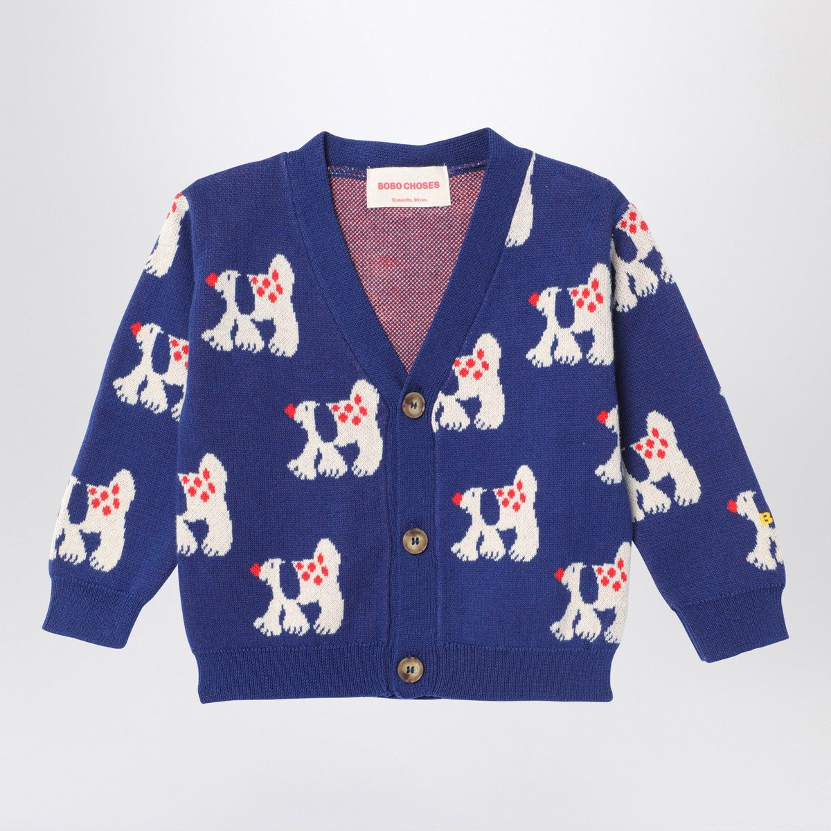 Navy blue organic cotton cardigan from Bobo Choses featuring a V-neck, long sleeves, a front button fastening, jacquard embroidery with all over doggies, a loose fit and ribbed edges.