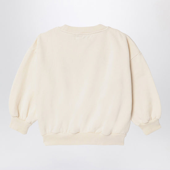 Ivory organic cotton crewneck sweatshirt from Bobo Choses featuring long sleeves, front logo print, ribbed edges and brushed fleece lining.