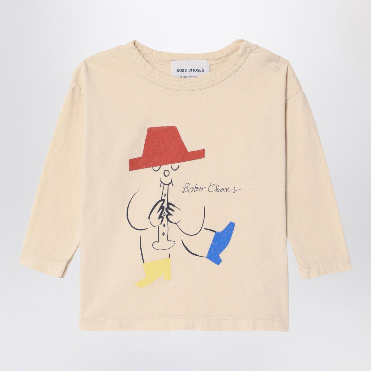 Ivory organic cotton crew-neck T-shirt from Bobo Choses featuring long sleeves, shoulder buttons, print on front and straight hem.
