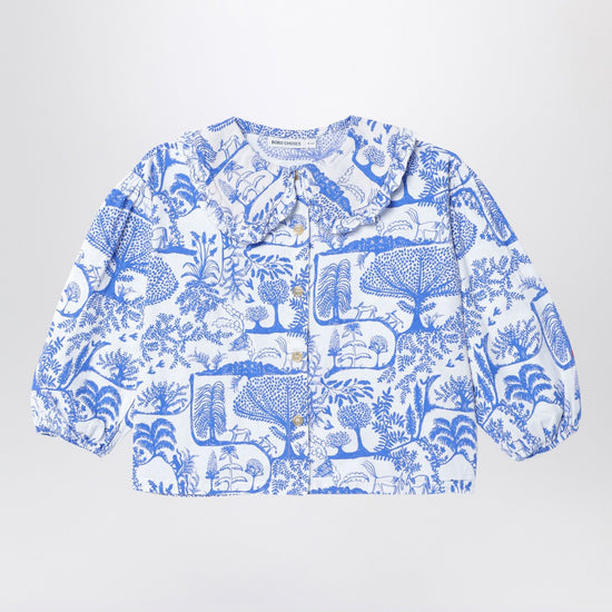 White cotton blouse from Bobo Choses with a light blue print, featuring a wide collar, long sleeves with elasticated cuffs and a front button fastening.