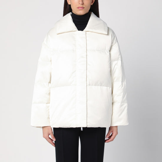 White Calvin Klein padded jacket featuring long sleeves, a concealed front zip and button fastening, a wide collar and a back logo patch. Size and Fit - Model wears size S Model measurements: Height: 179 cm Chest: 82 cm Waist: 65 cm Hips: 90 cm
