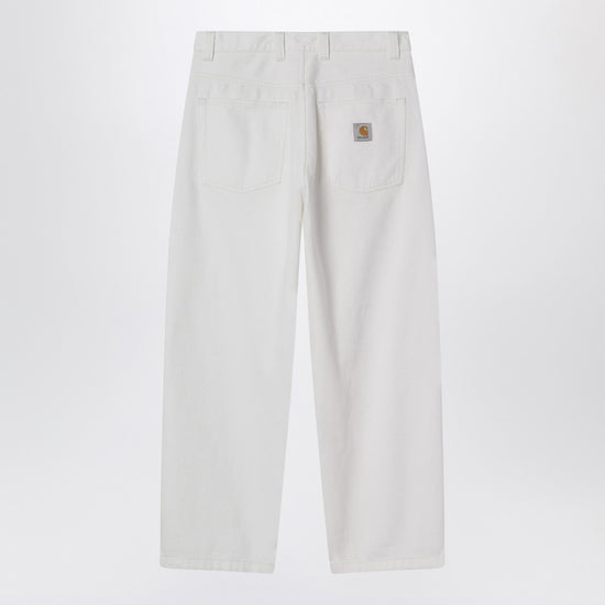 Carhartt WIP white heavy cotton denim pants, characterized by a loose straight fit, low crotch, back yoke, numerous pockets including one with a square fabric logo label, loose straight fit, zip and button closure, and belt loops. Size and Fit - Model wears size L Model measurements: Height: 187 cm Chest: 102 cm Waist: 76 cm Hips: 92 cm
