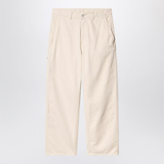 Carhartt WIP pants in medium weight cotton twill in Natural colour, characterized by a comfortable and tapered leg, triple stitching details, tool pockets, heart-shaped logo patch on the back, relaxed tapered fit, regular waist with belt loops, bar tacks or rivets at high wear points, and front closure with zip and button. Size and Fit - Model wears size S Model measurements: Height: 187 cm Chest: 102 cm Waist: 76 cm Hips: 92 cm