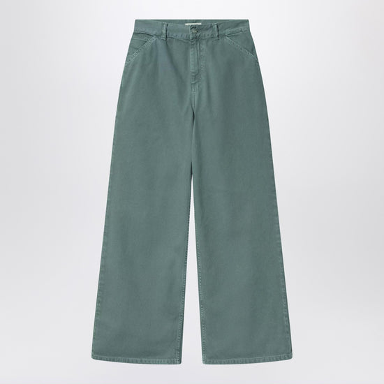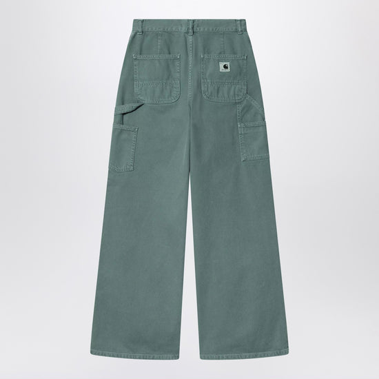 Carhartt WIP pants in heavy cotton twill in Silver Pine colour, characterized by a wide and oversized fit, high waist, bar tacks, tool pockets, hammer loop, front closure with zip and button, belt loops, and numerous pockets including one with a square fabric label on the back. Size and Fit - Model wears size 26 Model measurements: Height: 179 cm Chest: 82 cm Waist: 65 cm Hips: 90 cm