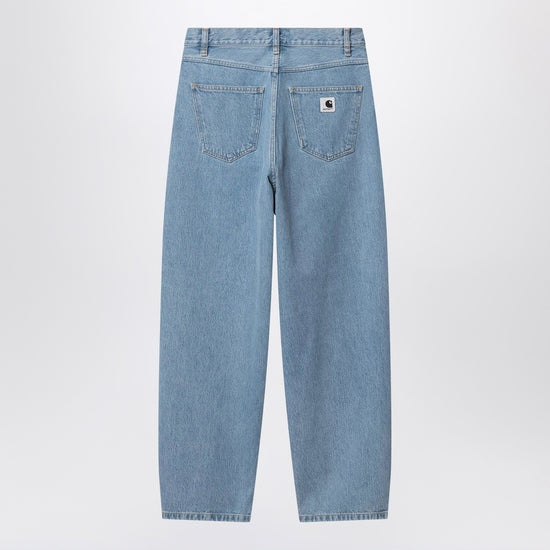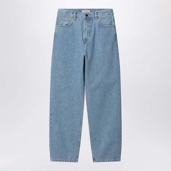 Carhartt WIP Smith denim pants in light blue heavy cotton, characterized by a wide leg, regular waist, five pockets, back yoke, square fabric logo label on the back, front closure with zip and button, and belt loops. Size and Fit - Model wears size S Model measurements: Height: 180 cm Chest: 85 cm Waist: 66 cm Hips: 89 cm
