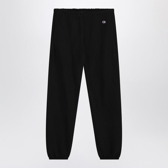 Black cotton Champion trousers with elasticated waist, two side welt pockets, small logo patch on the front and a patch pocket on the back.