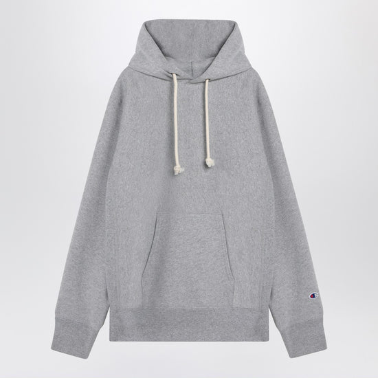 Light grey cotton sweatshirt from Champion, featuring a hood with drawstring, a kangaroo pocket on the front, long sleeves with a small logo patch on the wrist and ribbed edges.