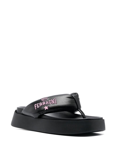 quilted flatform flip flops from CHIARA FERRAGNI featuring black, embroidered logo, single toe strap, quilted, flatform sole and slip-on style. CF Platform flip flops Size and Fit - Heel 2 in / 5 cm; Platform 1,4 in / 3,5 cm