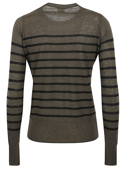 Crew neck sweater, long sleeves, ribbed hems, striped pattern and straight cut. Wool striped sweater Size and Fit - This piece fits true to size. We recommend you get your regular size. Model is 1,75m / 5ft 8in wearing size 36 (FR)
