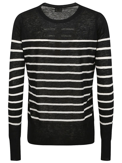 Crew neck sweater, long sleeves, ribbed hems, striped pattern and straight cut. Wool striped sweater Size and Fit - This piece fits true to size. We recommend you get your regular size. Model is 1,75m / 5ft 8in wearing size 36 (FR)