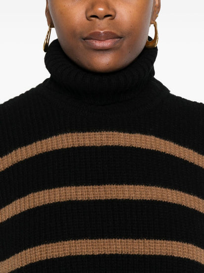 black wool turtleneck neckline sleeveless horizontal stripes brown stripes Wool turtle-neck sweater