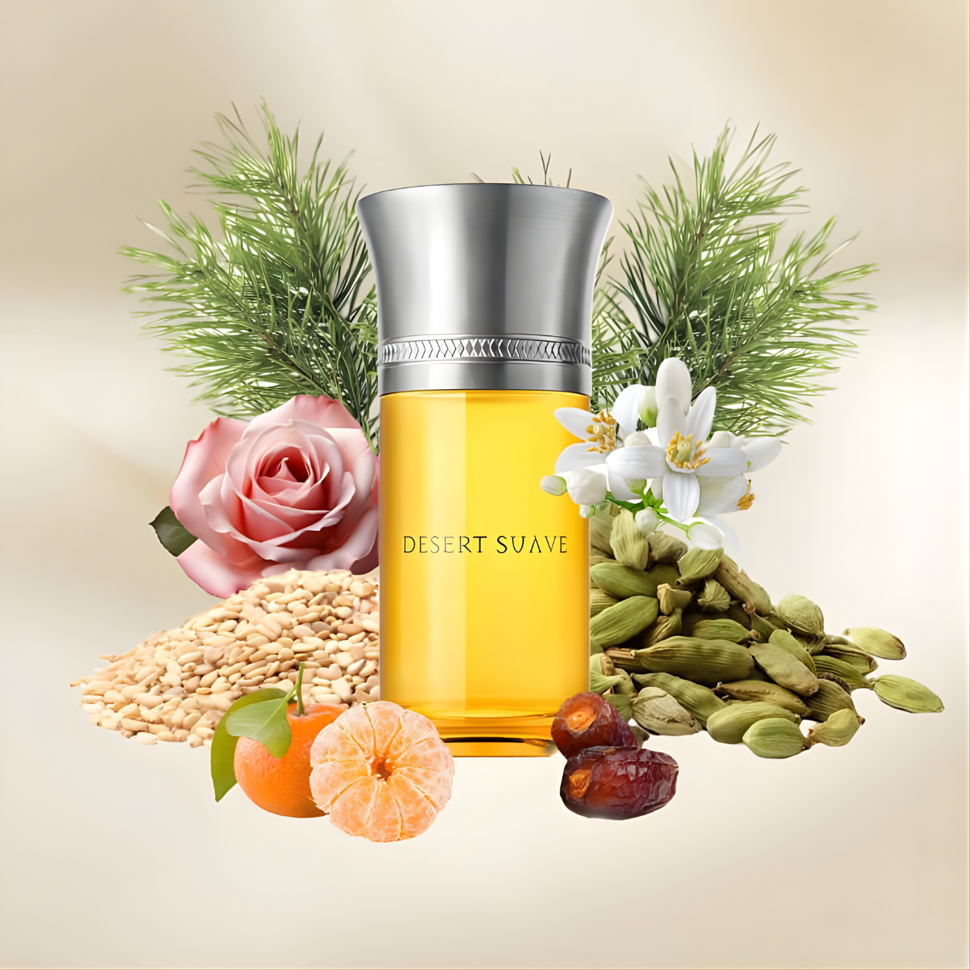 Désert Suave opens with a vibrant blend of cardamom, mandarin, and clove, delivering a warm and spicy introduction. The heart reveals a harmonious fusion of orange blossom, rose, and date, adding a rich, floral, and fruity depth. As the fragrance matures, it settles into a base of cistus, toasted sesame seeds, and cedar, offering a warm and lasting impression. This composition captures the essence of an oasis, blending the lushness of date palms with the warmth of the desert landscape.