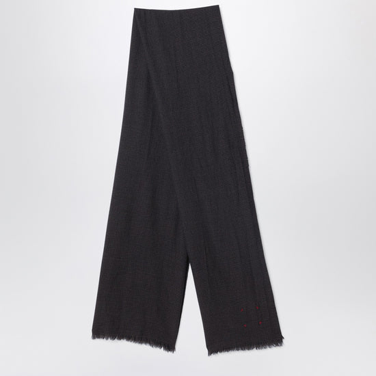 Wool scarf by Destin Surl, featuring a black and beige check pattern, fringed edges and bandana logo tag.
