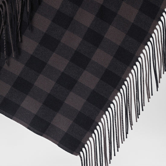 Shawl by Destin Surl in wool and cashmere featuring a black and brown check pattern and frayed edges.