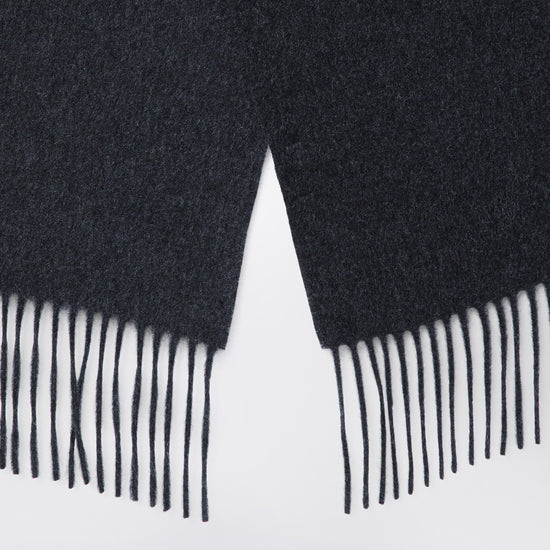 Dark grey cashmere scarf by Destin Surl with small fringed edges.