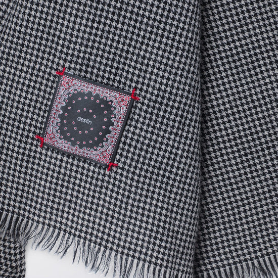 Wool scarf by Destin Surl, featuring a white and black check pattern, fringed edges and bandana logo tag.