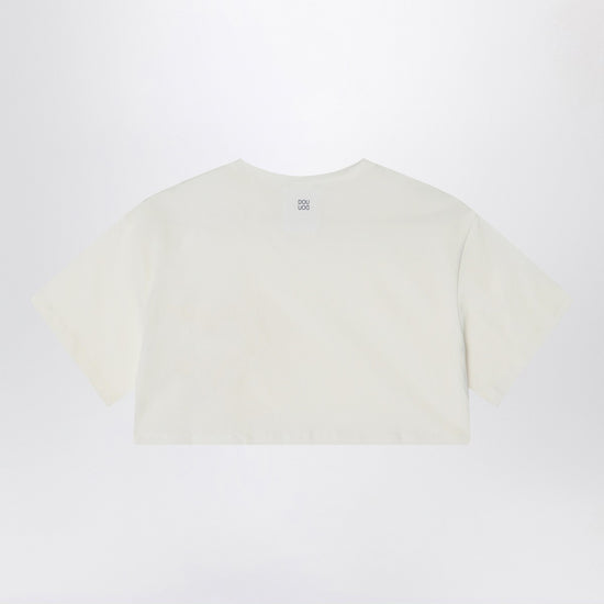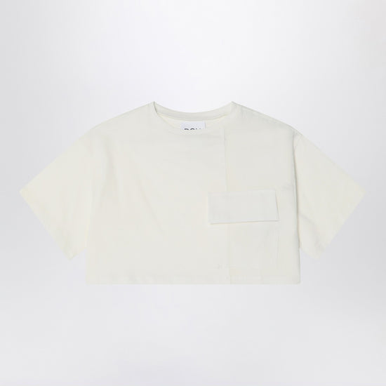 Cropped crew neck T-shirt by Douuod in ivory cotton, featuring short sleeves, an applied chest pocket with flap, and contrasting logo lettering on the back.