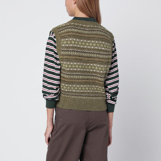 Olive green wool blend Dunst gilet with contrasting weave, featuring a V-neck and ribbed edges. Size and Fit - Model wears size S Model measurements: Height: 182 cm Chest: 79 cm Waist: 62 cm Hips: 90 cm