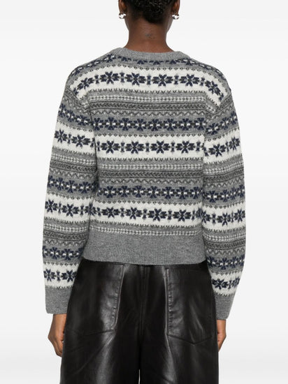 grey fairisle pattern round neck long sleeves ribbed cuffs ribbed hem Wool blend crewneck jumper