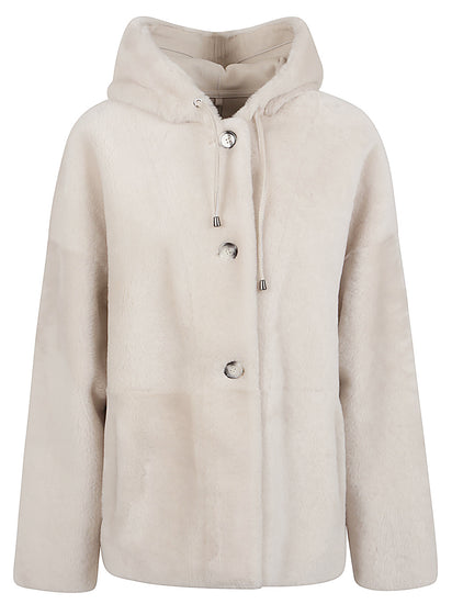 Jacket with hood, long sleeves, dropped shoulders, front button closure and two welt pockets. Fur hooded jacket Size and Fit - This piece fits true to size. We recommend you get your regular size. Model is 1,75m / 5ft 8in wearing size 36 (FR)