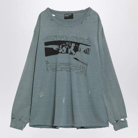 T-shirt by Enfants Riches Déprimés in faded blue cotton jersey with a vintage effect, characterized by a crew neck and ribbed cuffs, long sleeves, contrasting front and back print, and details with localized wear. Size and Fit - Model wears size L Model measurements: Height: 187 cm Chest: 102 cm Waist: 76 cm Hips: 92 cm