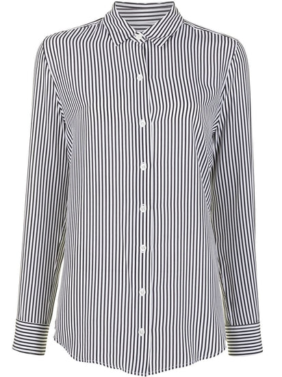 white/blue silk vertical stripe pattern classic collar front button fastening long sleeves Striped silk shirt Size and Fit - This piece fits true to size. We recommend you get your regular size. Model is 1,75m / 5ft 8in wearing size S