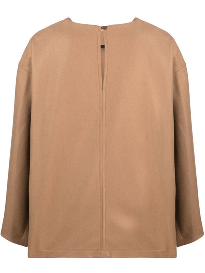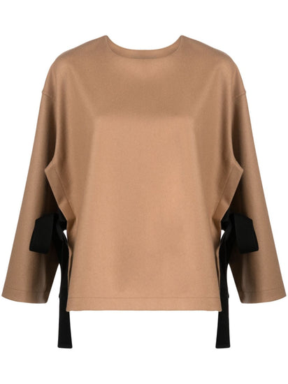 camel brown/black wool blend terry-cloth effect round neck rear button fastening side tie fastening drop shoulder long sleeves side slits straight hem Nara wool blend blouse Size and Fit - This piece fits true to size. We recommend you get your regular size. Model is 1,75m / 5ft 8in wearing size 40 (IT)