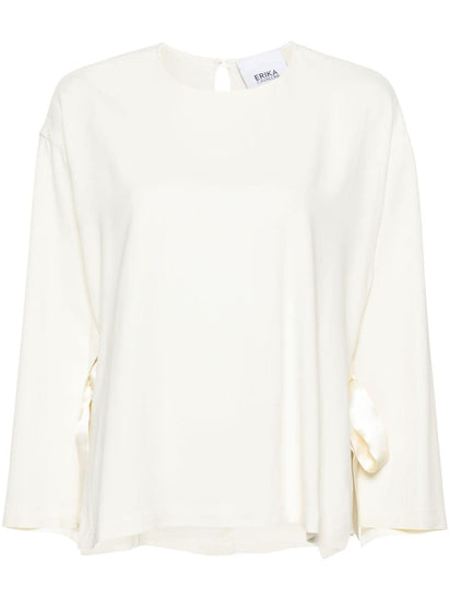 beige cady texture round neck open wide sleeves straight hem satin self-tie fastening Cady texture blouse Size and Fit - This piece fits true to size. We recommend you get your regular size. Model is 1,75m / 5ft 8in wearing size 40 (IT)