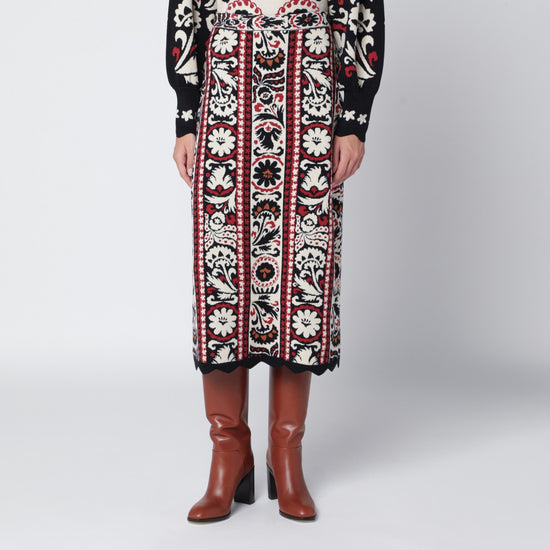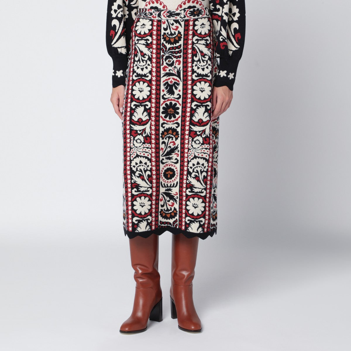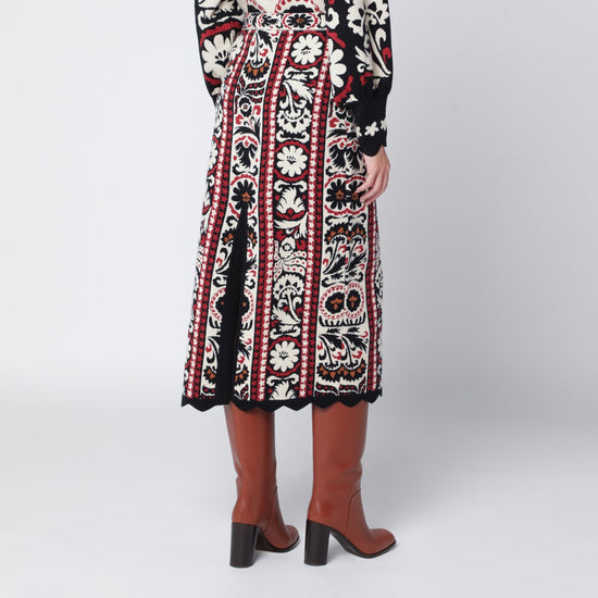 Farm Rio ivory striped midi skirt with tapestry in red and black tones, featuring elastic waistband, back slit, and wavy hem. Size and Fit - Model wears size S Model measurements: Height: 182 cm Chest: 79 cm Waist: 62 cm Hips: 90 cm