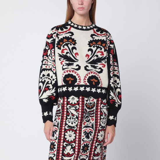 Farm Rio ivory crewneck sweater with tapestry in red and black tones, featuring balloon sleeves and wavy hem. Size and Fit - Model wears size S Model measurements: Height: 182 cm Chest: 79 cm Waist: 62 cm Hips: 90 cm