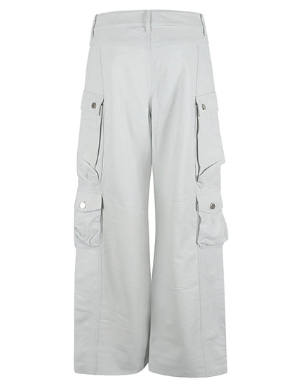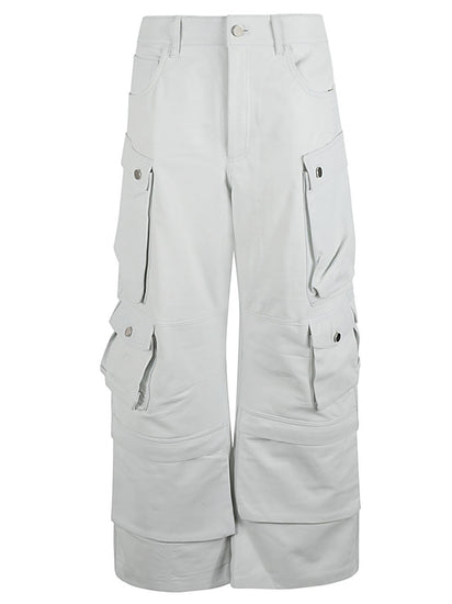 White cargo trousers, side pockets on Entmbi Figure, zip and button closure, currency pocket, pocket closure with buttons. Leather cargo pants Size and Fit - This piece fits true to size. We recommend you get your regular size. Model is 1,75m / 5ft 8in wearing size 40 (IT)