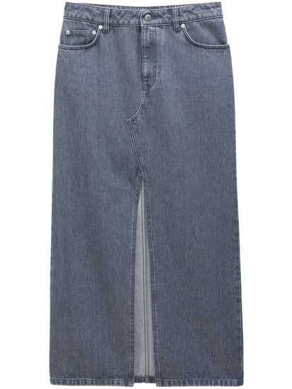 grey organic cotton denim appliqué logo front slit belt loops front button fastening classic five pockets maxi straight hem This item is made from at least 50% organic materials. Learn more about what makes a product Conscious on our Conscious Criteria page Slit denim long skirt Size and Fit - This piece fits true to size. We recommend you get your regular size. Model is 1,75m / 5ft 8in wearing size 36 (FR)