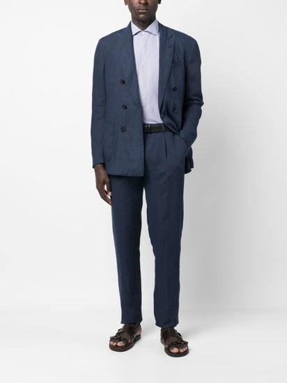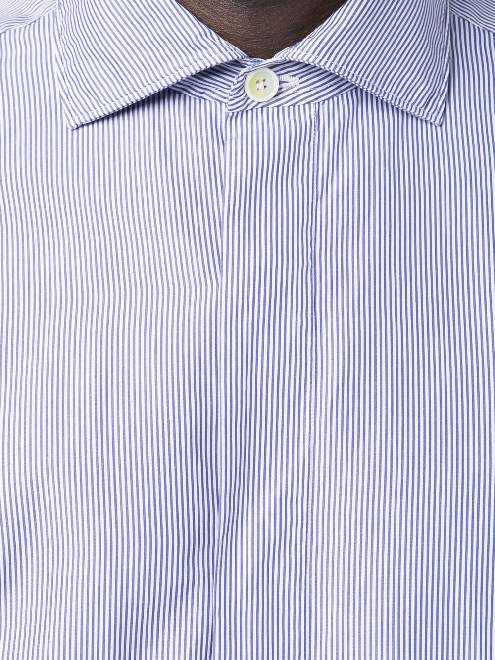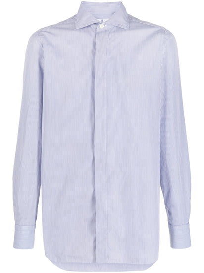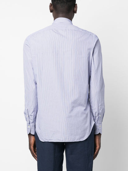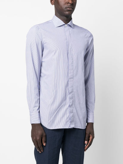 long-sleeve cotton shirt from FINAMORE 1925 NAPOLI featuring blue/white, cotton, vertical stripe pattern, classic collar, concealed front button fastening, long sleeves and curved hem. Regular fit striped cotton shirt Size and Fit - This piece fits true to size. We recommend you get your regular size. Model is 1,84m / 6ft 1in wearing size 39 (COLLAR CM)