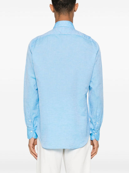 sky blue cotton-linen blend spread collar long sleeves with buttoned cuffs curved hem front button fastening Cotton and linen blend shirt Size and Fit - This piece fits true to size. We recommend you get your regular size. Model is 1,84m / 6ft 1in wearing size 39 (COLLAR CM)