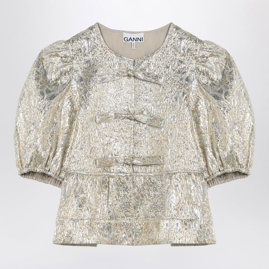 Recycled fabric blend choker blouse from Ganni featuring a gold and silver-tone print, featuring puff sleeves with elasticated edges, bows at the front and a relaxed fit. Size and Fit - Model wears size 36 FR Model measurements: Height: 179 cm Chest: 82 cm Waist: 65 cm Hips: 90 cm
