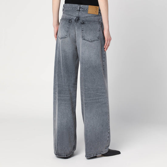 Wide jeans by Haikure in grey washed cotton denim, characterized by a high waist with belt loops, front closure with zip and button, five classic pockets, and a back logo patch. Size and Fit - Model wears size 26 Model measurements: Height: 179 cm Chest: 83 cm Waist: 61 cm Hips: 88 cm