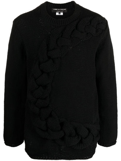 core black chunky cable knit crew neck drop shoulder long sleeves ribbed cuffs and hem  Cable-knit crewneck sweater Size and Fit - This piece fits true to size. We recommend you get your regular size. Model is 1,84m / 6ft 1in wearing size M