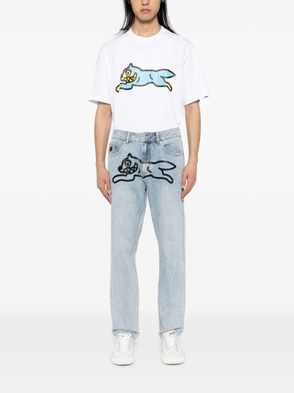 white cotton crew neck short sleeves logo patch at the sleeve graphic print to the front logo print to the rear straight hem Running Dog cotton t-shirt