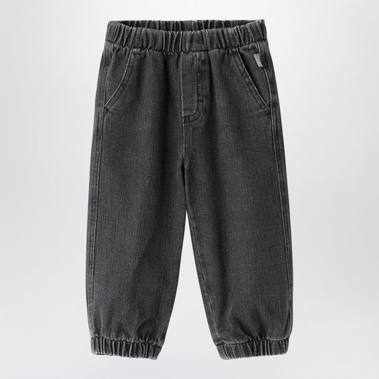 Jeans from Il Gufo in washed black cotton denim, featuring an elasticated waist, two welt pockets on the side with logo patch, two pockets on the back and elasticated ankles.