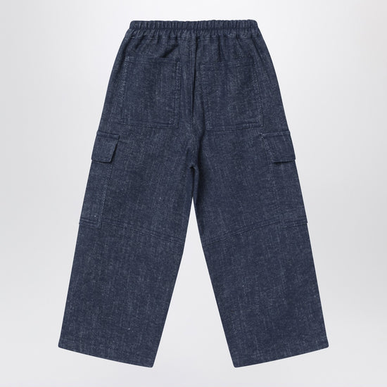 Il Gufo blue cotton denim trousers featuring elasticated waist, welt side pockets, back pockets and cargo side pockets.