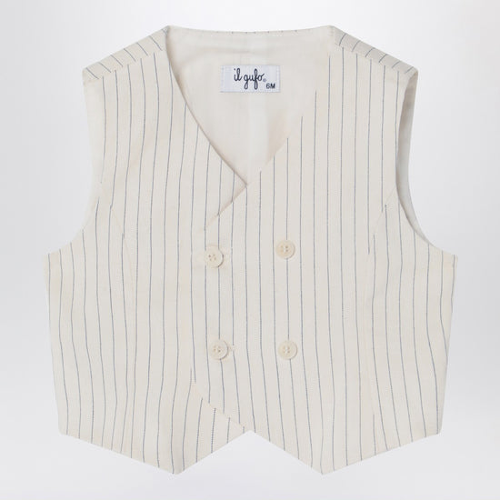 Double-breasted gilet by Il Gufo in milk white cotton blend with pinstripe pattern, characterized by front buttoning, V-neck, and elastic detail on the back.