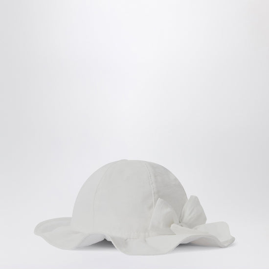 Hat by Il Gufo in white viscose poplin, characterized by a wide brim with ruffled edge, decorative bow, and cotton lining.