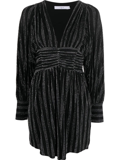 mettalic-ribbed long-sleeves dress from IRO featuring black, silver-tone, metallic effect, vertical stripe pattern, textured finish, plunging V-neck, gathering at the hip, long sleeves and fitted-cuff sleeves. Gaida short viscose dress Size and Fit - This piece fits true to size. We recommend you get your regular size. Model is 1,75m / 5ft 8in wearing size 36 (FR)