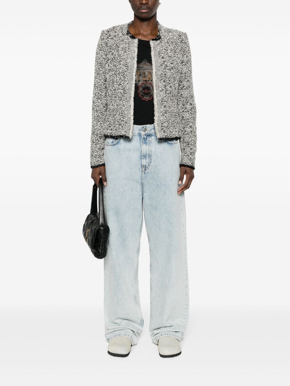 black/white tweed frayed edge round neck open front long sleeves two chest patch pockets two front welt pockets straight hem unlined Hazela cotton blend jacket Size and Fit - This piece fits true to size. We recommend you get your regular size. Model is 1,75m / 5ft 8in wearing size 36 (FR)