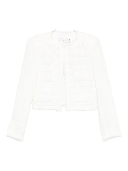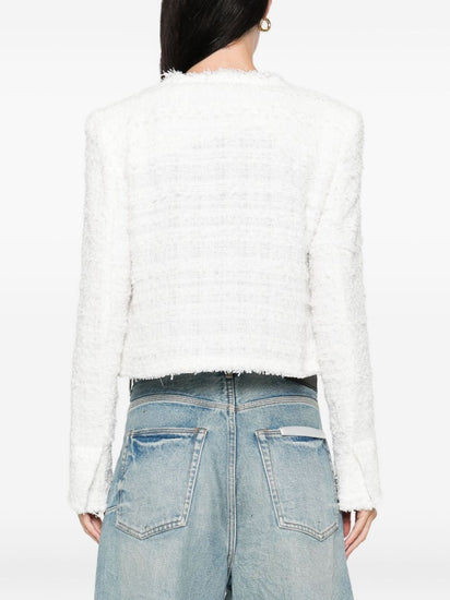 white tweed texture frayed edges open front patch pockets long sleeves Safira cotton blend jacket